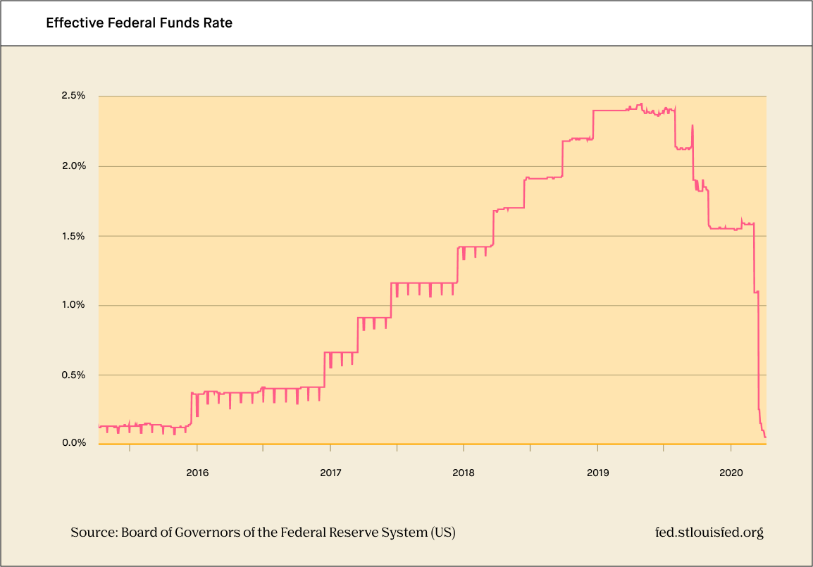 To help avoid disruptions in banking services and ensure that depository institutions (e.g., banks, credit unions) can keep moving money smoothly, the Fed lowered its target range for the Fed Funds Rate in mid-March to 0–0.25%. Interest rates haven’t been this low since the financial crisis in 2008, a strong sign that the economy has slowed.
